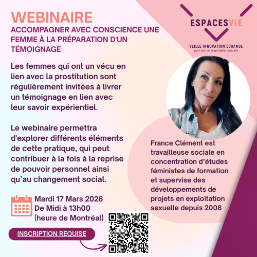 Les femmes qui ont un vécu en lien avec la prostitution sont régulièrement invitées à livrer un témoignage en lien avec leur savoir expérientiel. Le webinaire permettra d’explorer différents éléments centraux de cette pratique qui peut contribuer à la fois à la reprise de pouvoir personnel qu’au changement social. Quels sont les différents types de témoignage en fonction de l’objectif et du public cible? Comment accompagner avec conscience une femme à la préparation de son témoignage? Comment s’assurer que le témoignage se situe dans un processus de reprise de pouvoir.